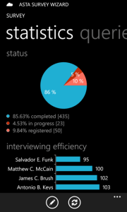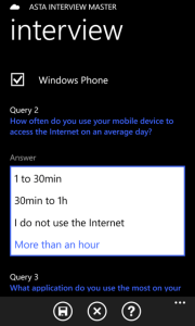And the Asta Interview Master application enables conducting interviews using defined surveys. It features a simple and intuitive interface — answers are selected from drop-down or check-box lists, out-of-context queries are automatically skipped, multimedia can be attached by recording voice or taking a photo with an embedded camera, etc. Completed questionnaires with attached geo-position-related information are sent on-line to the central repository and can be viewed immediately, or business intelligence can be used to process the data from the questionnaires off-line. Both applications are available on Windows smartphones as well as on Windows tablets.
