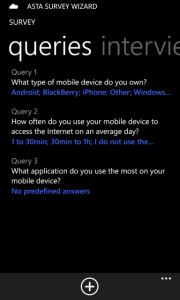 The Asta Survey Wizard application allows for freely defining surveys — one can add a new survey, define a number of open and closed queries, edit questions and answers, specify the single- or multiple-choice mode for closed-answer queries, link queries by specifying which answers unlock which queries, require attaching multimedia (pictures, videos, documents, etc.) while answering a query.